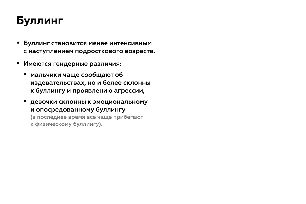 Еще один факт, который отмечают ученые, заключается в том, что мальчики чаще сообщают о том, что над ними издеваются, чем девочки. Таким образом, выбор вида буллинга и его жертвы может быть гендерно обусловлен. На сегодняшний день мальчики чаще прибегают к физическому буллингу, а девочки — к социальному, опосредованному, а также применяют эмоциональные средства травли. Однако в последние годы ситуация начинает немного меняться: девочки прибегают к физической травле чаще, чем, к примеру, десять лет назад.