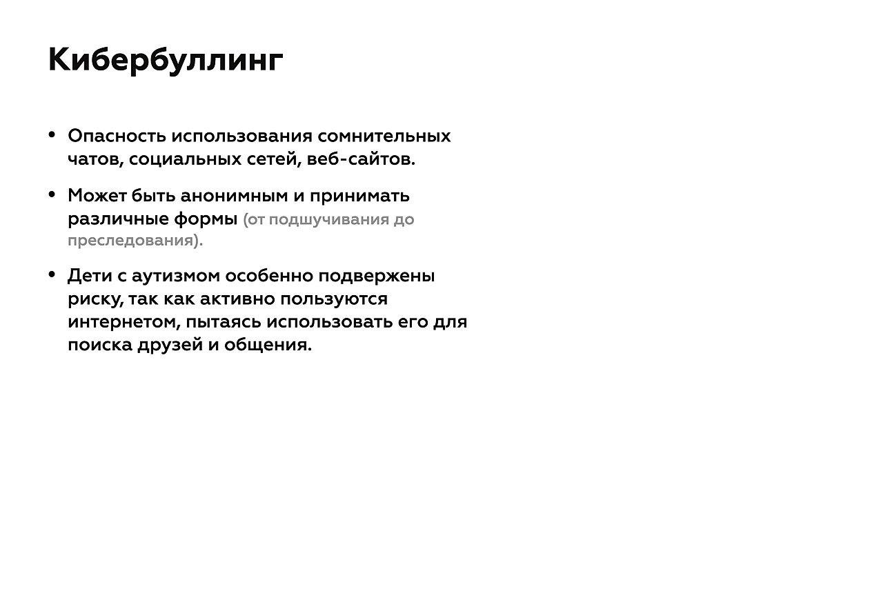 Этот вид травли еще уникален тем, что он может продолжаться круглосуточно. Кибербуллинг представляет собой особую проблему для детей с РАС, которые часто много времени проводят в интернете, пытаясь использовать его для поиска друзей и общения. Для этого вида буллинга характерны последствия в виде злоупотребления алкоголем и наркотиками, особенно по мере того, как дети становятся старше. Они начинают избегать посещения школы, у них возникают проблемы с успеваемостью, а также усугубляются проблемы с самооценкой.