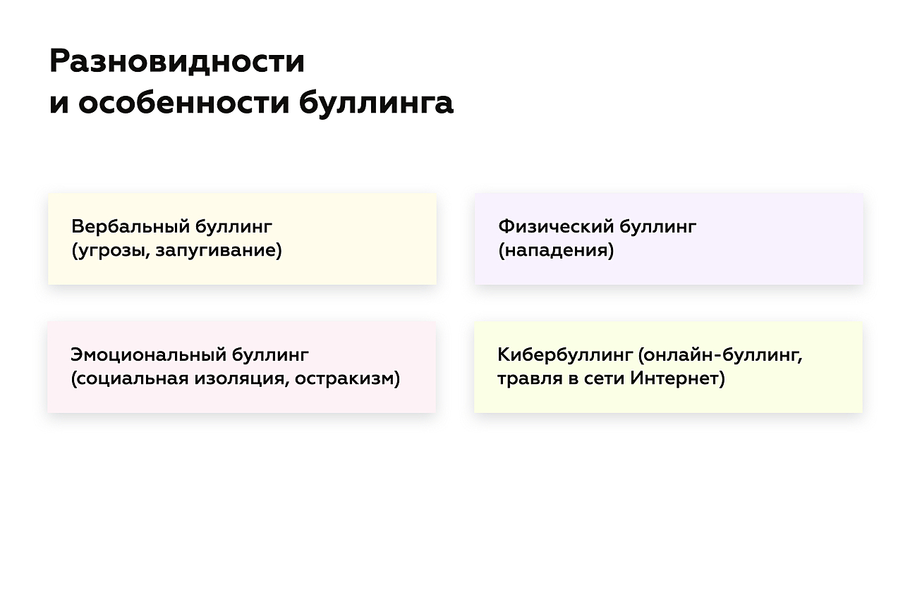Существуют различные виды буллинга: вербальный, физический и эмоциональный. При вербальном буллинге для выражения угрозы и запугивания используются слова. Физический буллинг проявляется в виде нападений, отбирания у ребенка чего-либо, например карманных денег, планшета или телефона. Эмоциональный буллинг предполагает использование способов причинения эмоциональной боли другому человеку, например запрет на общение с ребенком, ведущей к его социальной изоляции.