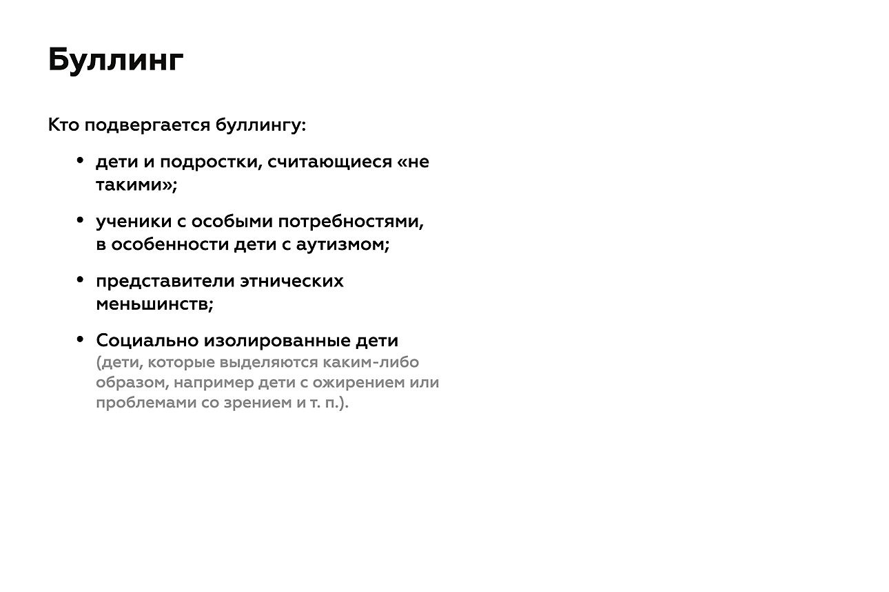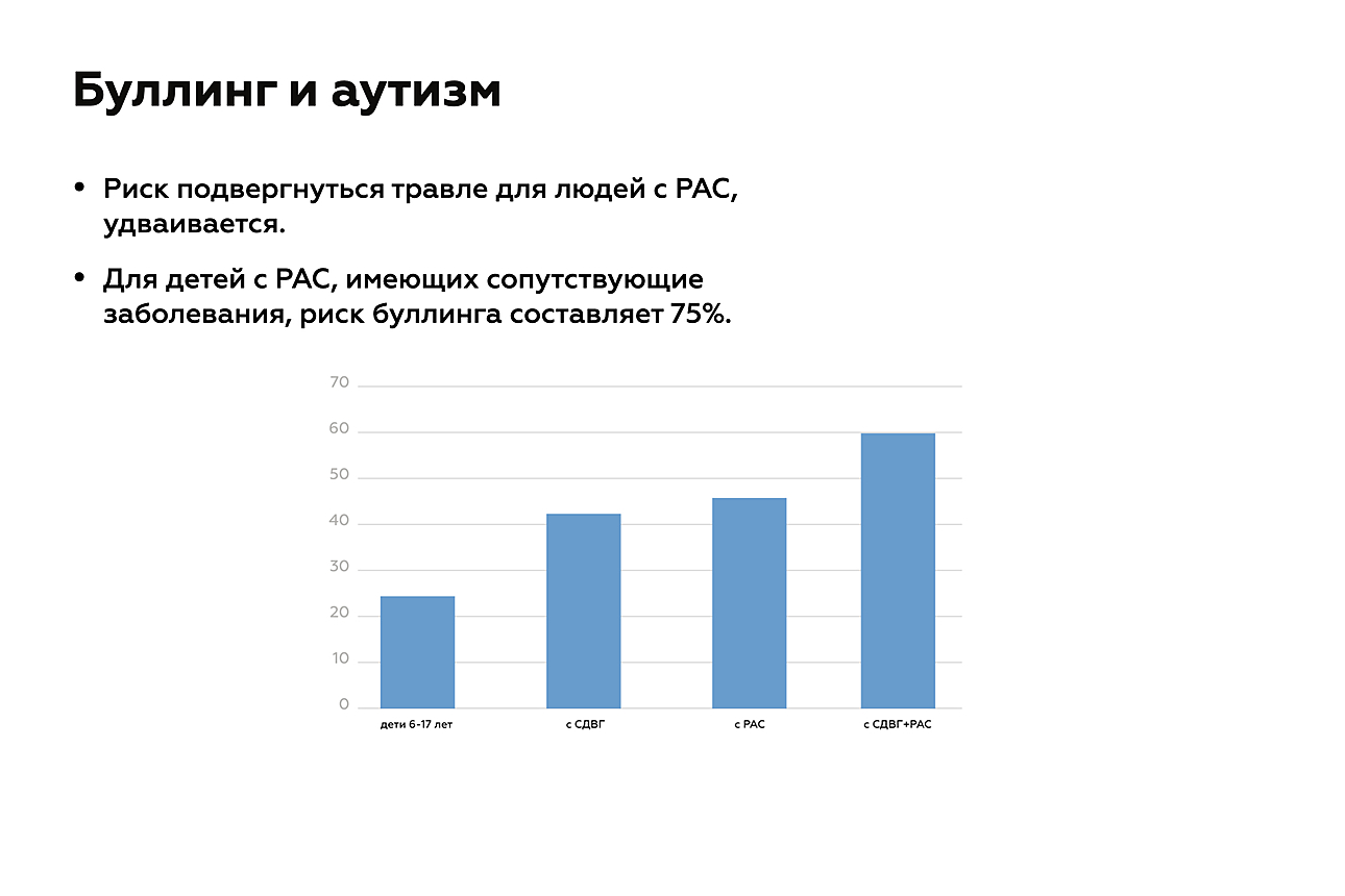 Если у ребенка аутизм, вероятность того, что над ним будут издеваться в школьном коллективе, увеличивается вдвое — примерно до 40%. Если аутизм осложняется, например, тревожностью или депрессией, то вероятность стать жертвой буллинга возрастает до 75%. Таким образом, аутизм и ряд других проблем значительно повышают риск подвергнуться издевательствам.