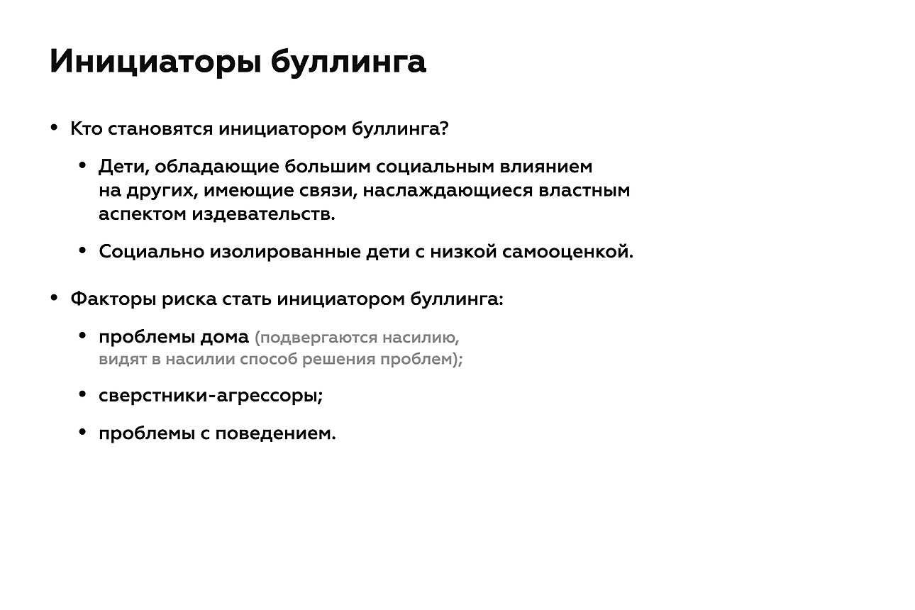 Можно выделить два основных типа детей, рискующих стать инициаторами буллинга. Первый тип — это дети, обладающие большим социальным влиянием на других, имеющие связи, наслаждающиеся властью, которую они ощущают во время издевательств над другими детьми.