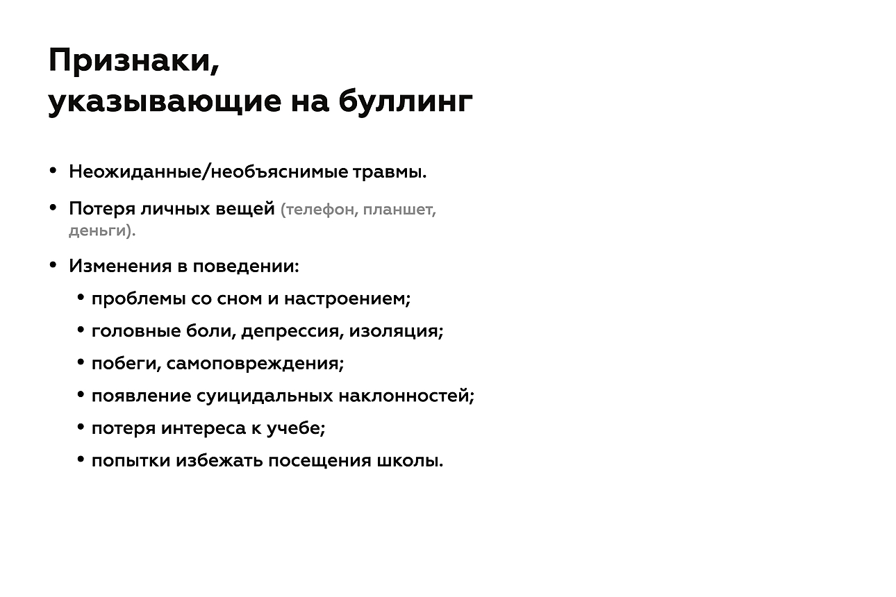 К признакам, указывающим на буллинг, относятся неожиданные необъяснимые травмы у ребенка, потеря личных вещей (планшеты, деньги, телефоны, подаренные сувениры, канцелярские принадлежности), изменения в поведении, проблемы со сном и настроением, головные боли, депрессия. Также могут проявляться и физические симптомы, например боли в животе. Кроме того, у детей может наблюдаться опасное поведение: побеги из школы и дома, самоповреждения, появление разговоров о самоубийстве, а также снижение успеваемости и потеря интереса к школе. Некоторые дети, находящиеся в ситуации буллинга, стараются последовательно избегать школы, чтобы не сталкиваться с травлей. К сожалению, таких примеров множество, и они не всегда однозначны. Нередко их сложно определить и по той причине, что педагоги школы скрывают факты буллинга, хотя наблюдают их. Дети, которые не могу рассказать о том, что происходит с ними в учебном учреждении, становятся объектами буллинга значительно чаще, так как поведение агрессии в отношении их остается безнаказанным. К сожалению, встречаются ситуации, когда педагоги знают о ситуации и не сообщают о ней, как в примере с Настей: учителя и тьютор видели агрессию, направленную на нее, но боялись реакции родителей ребенка-обидчика и не сообщали об этом.