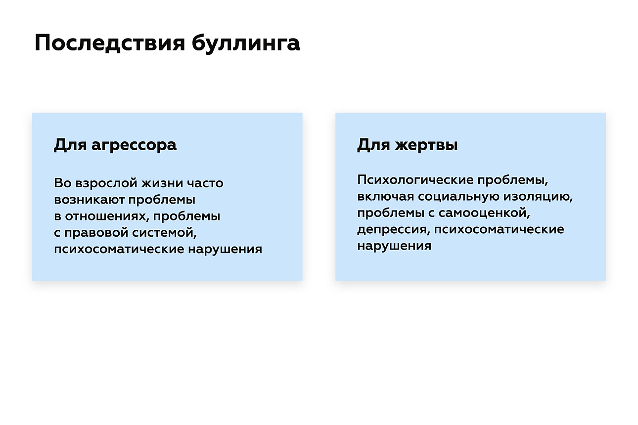 У агрессоров, инициирующих травлю, во взрослой жизни часто возникают проблемы с правовой системой, проблемы в отношениях и, что интересно, даже проблемы со здоровьем. Таким образом, для хулиганов буллинг зачастую это тоже процесс, ведущий к жизненному провалу. Им также нужна помощь, чтобы вырваться из порочного круга и научиться справляться с трудностями другими способами.
