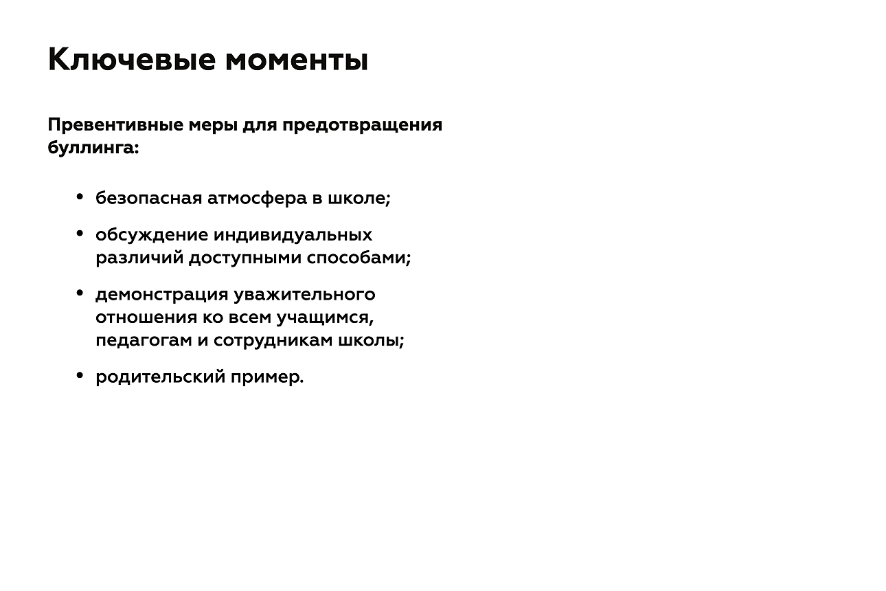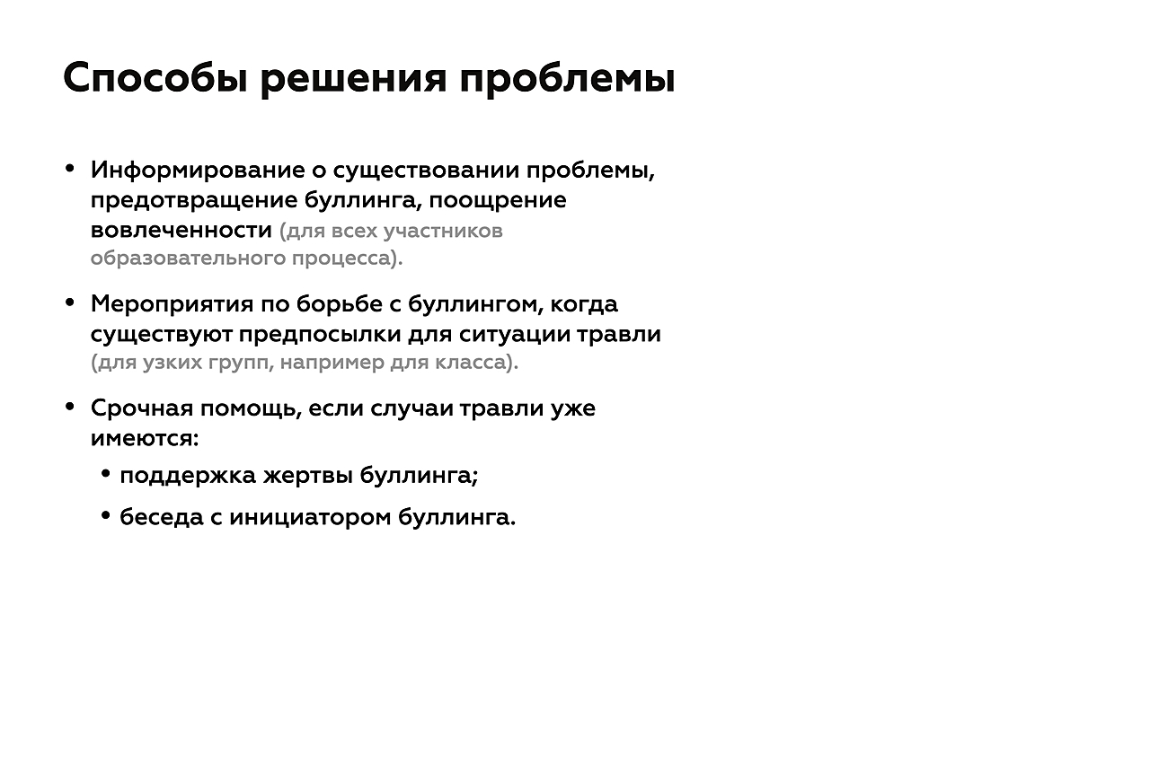 Итак, существует три уровня вмешательства. Первый — это предотвращение буллинга. Необходимо проводить мероприятия для всех учеников школы, в рамках которых рассказывают о буллинге, о том, как его распознать и как с ним справляться, а также о полной нетерпимости к данному явлению. Второй уровень — это когда вы видите предпосылки для ситуации травли. Здесь необходимо проводить мероприятия по борьбе с буллингом в пределах узкого коллектива (например, класса). И наконец, если случаи травли уже имеются, необходимо срочно проводить беседы как с жертвой, так и с агрессором, чтобы попытаться понять, в чем дело, и положить конец буллингу. Было бы правильным решением привлекать к этим мероприятиям специалистов — школьных или приглашенных психологов — и не оставлять в стороне ни малейшего эпизода похожего на травлю.