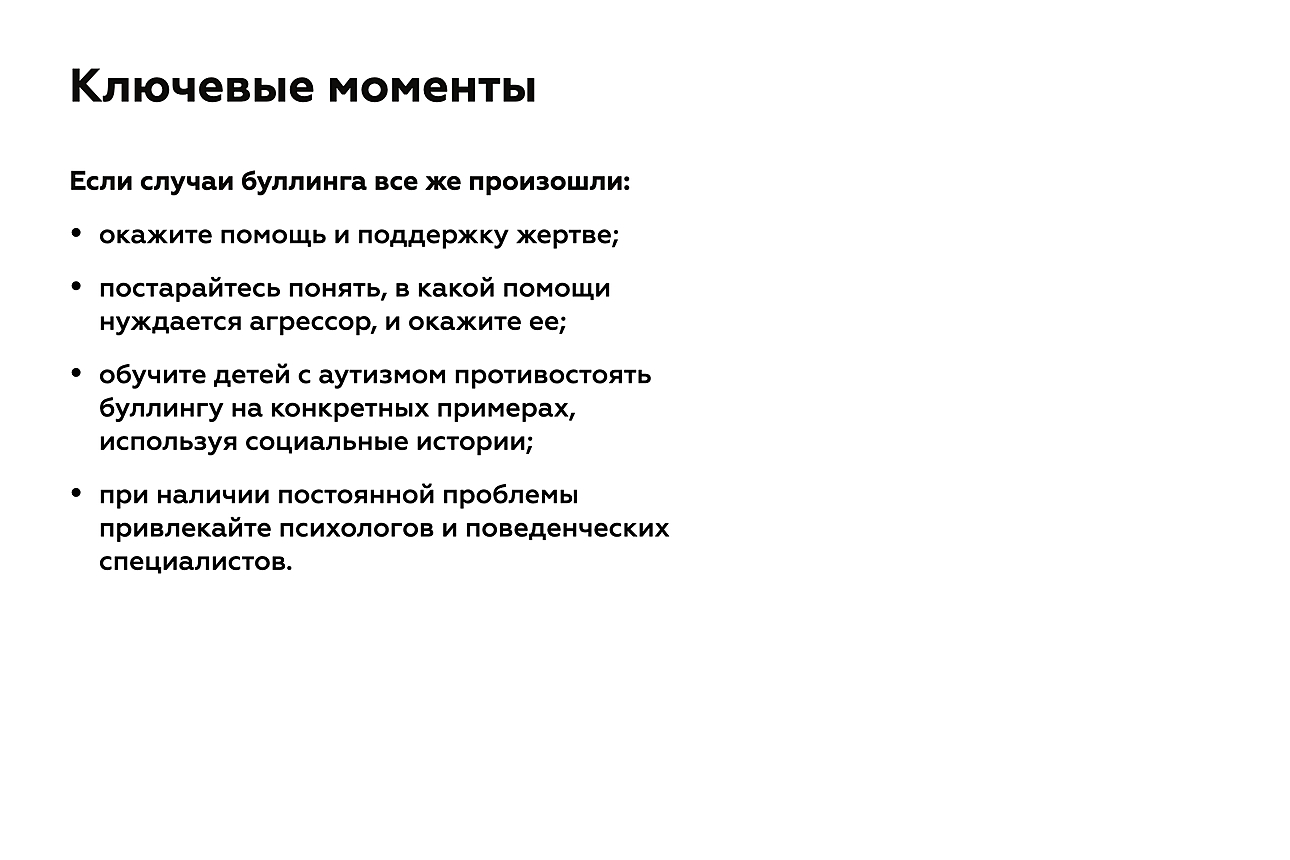 В рамках школы важно проводить специальные обучающие программы и объяснять ученикам серьезность проблемы буллинга. При этом следует помнить, что детей с аутизмом следует обучать на конкретных примерах. Для этого можно использовать социальные истории10 в картинках или комиксы, чтобы помочь детям понять, как правильно реагировать на издевательства.