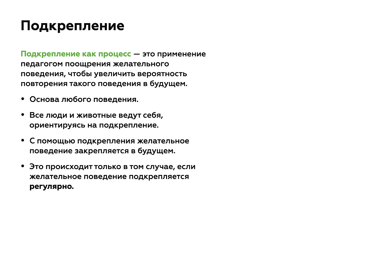 Когда мы говорим о подкреплении, мы должны понимать, что подкрепление — это основа любого поведения. И люди, и животные ведут себя, ориентируясь на подкрепление, которое увеличивает вероятность того, что поведение станет чаще повторяться в будущем, и происходит это только в том случае, если желательное поведение подкрепляется регулярно.