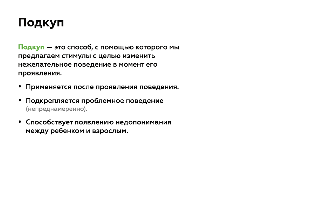 Теперь давайте поговорим о подкреплении и подкупе. Это важный момент, потому что подкрепление часто путают с подкупом, особенно в школьной среде. Повторим еще раз, что, когда мы говорим о подкреплении, мы имеем в виду процесс, с помощью которого мы закрепляем желательное поведение на будущее.