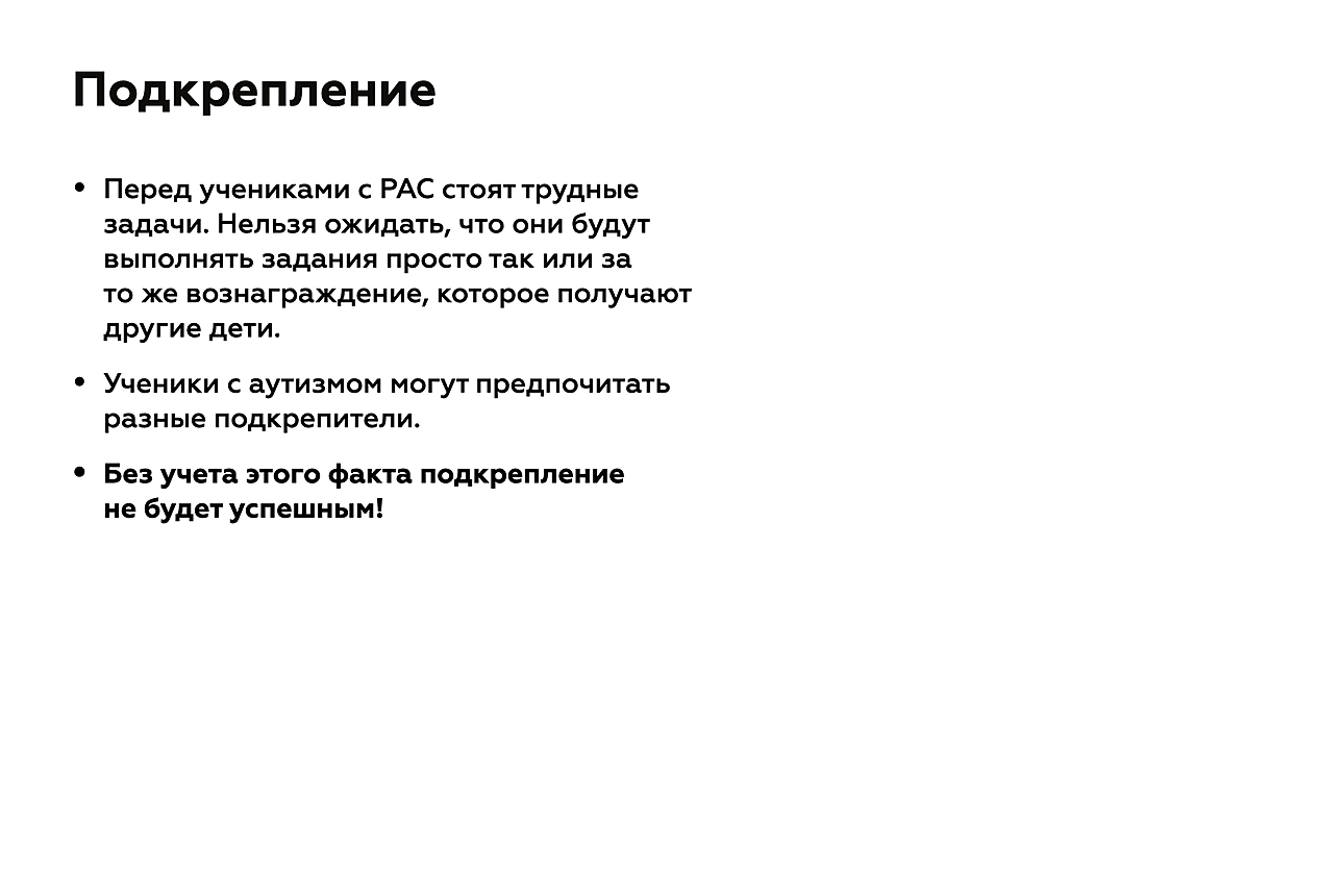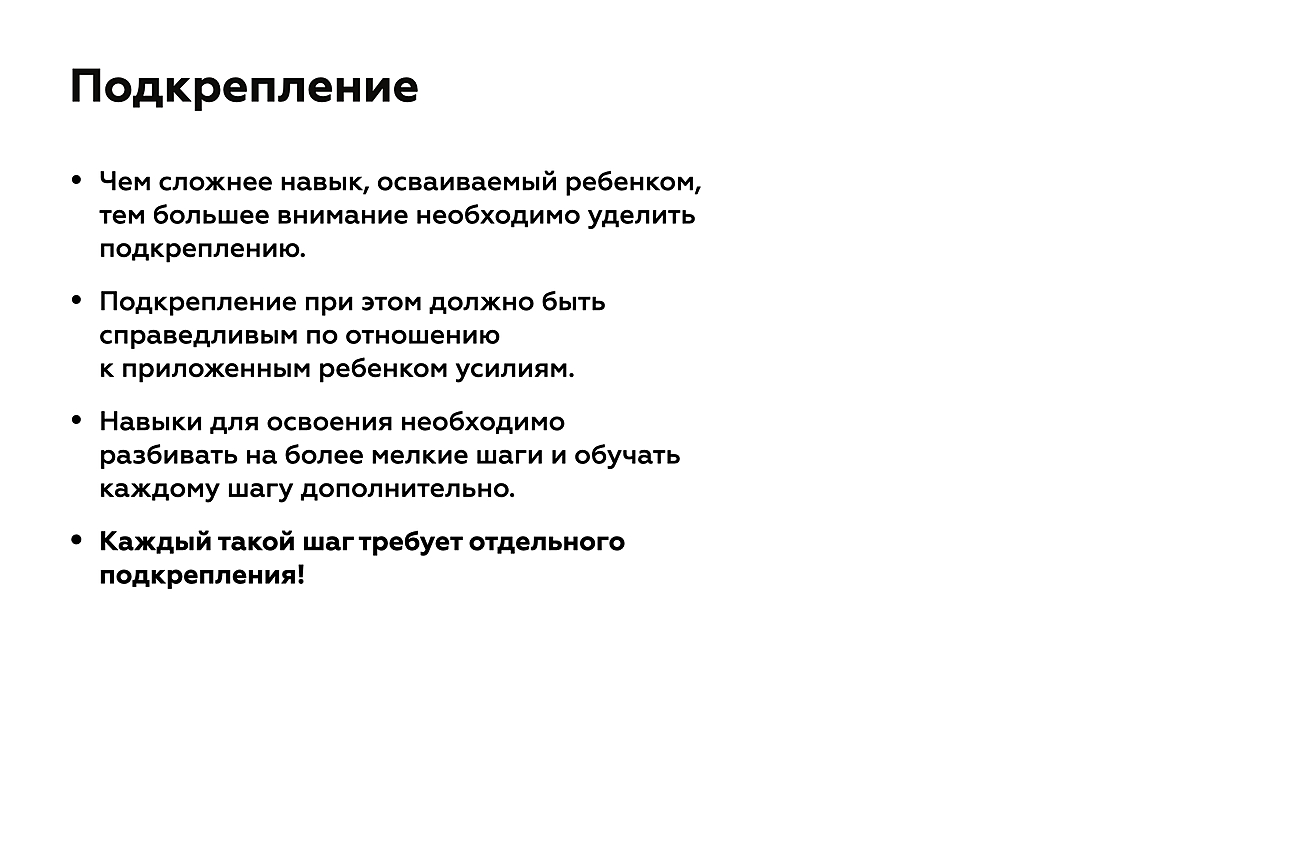 Учитывая особенности восприятия у детей с РАС, освоение многих навыков дается им с бóльшим трудом и требует бóльших усилий, чем у их сверстников, развивающихся типично. Многие навыки для освоения необходимо разбивать на более мелкие шаги и обучать каждому шагу дополнительно. Например, при обучении ребенка с аутизмом мыть руки, возможно, понадобится отдельно обучать его открывать кран, намыливать руки, смывать мыло, выключать воду и вытирать руки. И каждый такой шаг будет требовать отдельного подкрепления. Скорее всего, просто похвалы или одобрительного кивка здесь будет недостаточно.
