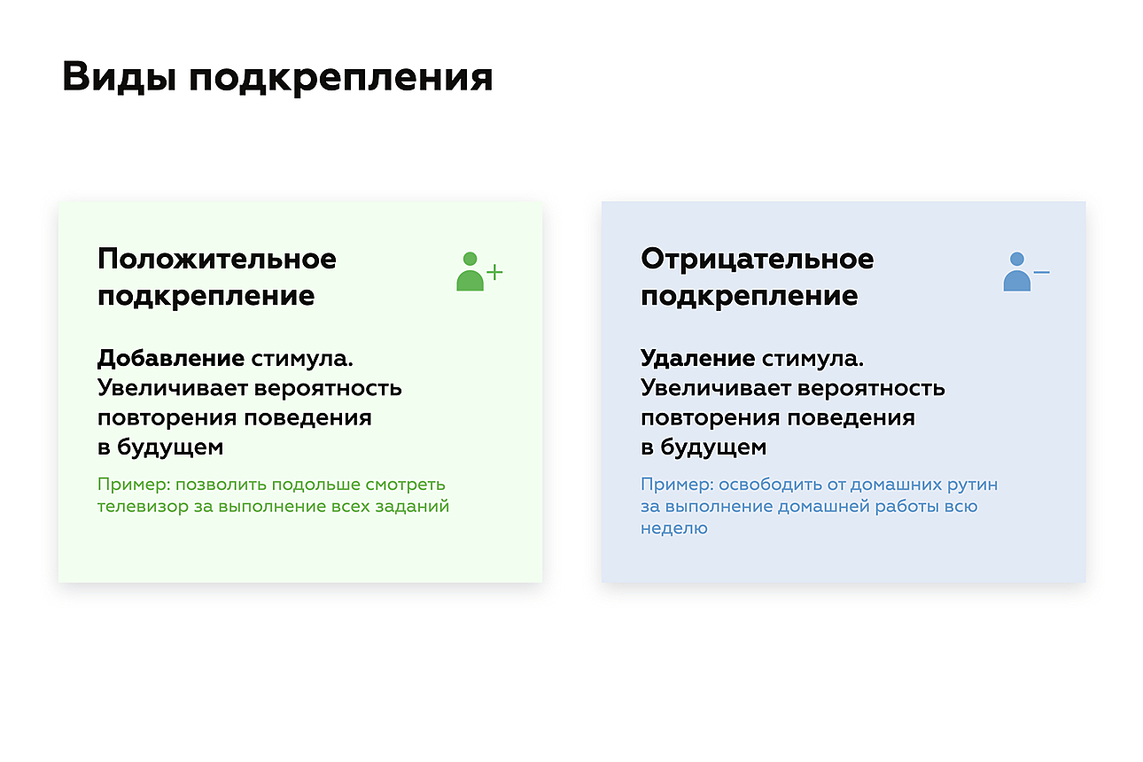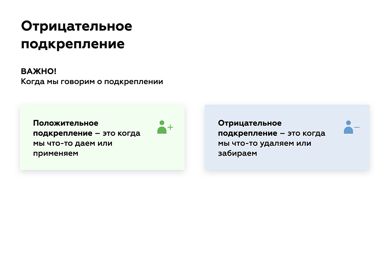 Теперь давайте рассмотрим различные виды подкрепления. Когда мы говорим о подкреплении как о процессе, важно помнить, что со временем оно всегда приводит к повторению поведения, независимо от того, о каком типе подкрепления мы говорим. Разница между положительным и отрицательным подкреплением состоит в том, что при положительном подкреплении мы добавляем стимул, а при отрицательном — убираем. Понятия «положительное» и «отрицательное» не связаны с результатом поведения или изменениями в нем. Наша цель состоит в том, чтобы поведение повторялось. Положительное в данном контексте не означает хорошее, а отрицательное — плохое. Речь идет только о том, что мы либо добавляем какой-то стимул, либо убираем.