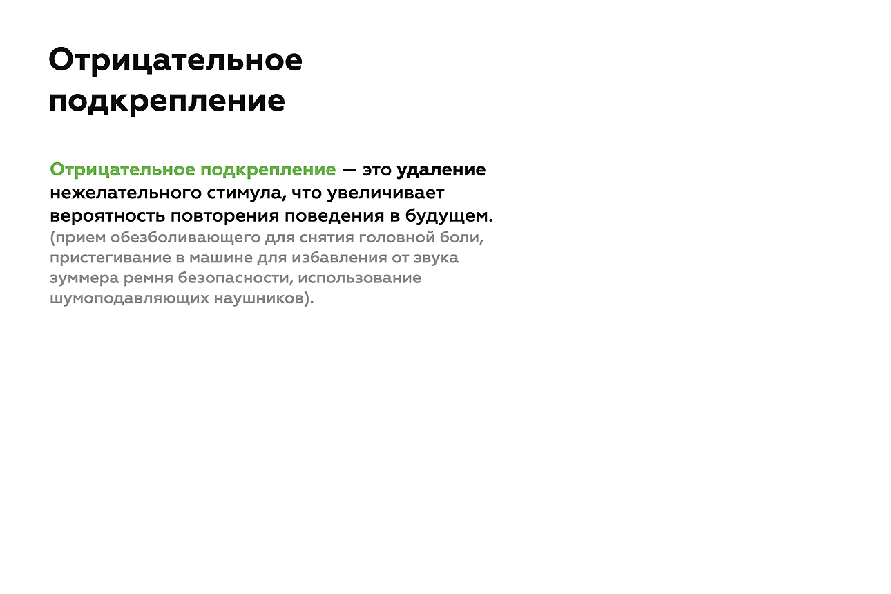 Приведем примеры отрицательного подкрепления у взрослых людей, например прием аспирина для снятия головной боли. Прием лекарства для устранения нежелательного стимула, например головной боли, означает, что в будущем мы, скорее всего, снова примем лекарство, когда у нас будет болеть голова, если это окажется эффективным. Привычка пристегиваться в машине, чтобы избавиться от раздражающего звука зуммера ремня безопасности или «дзиньканья», которое издает ваш автомобиль, также является примером отрицательного подкрепления. Мы пристегиваем ремень безопасности, пытаясь устранить этот надоедливый звук. Самый частый пример отрицательного подкрепления в школе: ученик, который первый решил все примеры правильно, освобождается от домашнего задания.