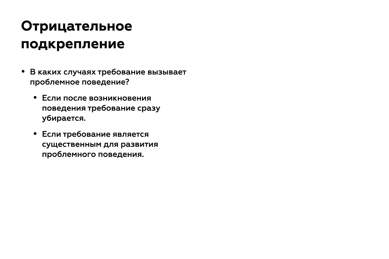 Федору 10 лет, он учится в 4 классе. На уроках Федор иногда демонстрирует нежелательное поведение, например ложится на пол под партой и отказывается вылезать. Учитель оставляет Федю в покое и игнорирует его поведение. В результате Федя с удовольствием лежит на полу и рассматривает окружающих. Ему это очень нравится. Это отрицательное подкрепление — убирание требований и игнорирование поведения. Как следствие, Федя будет ложиться на пол при любой удобной возможности, когда не захочет выполнять то или иное требование, что он и демонстрирует практически каждый день.