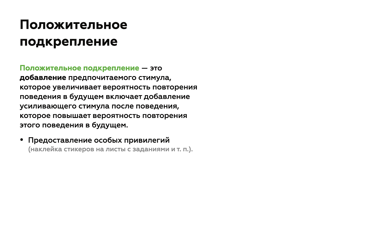 Давайте разберем положительное подкрепление более подробно. Говоря об этом типе подкрепления, необходимо упомянуть об оценке предпочтений7. Предпочитаемые стимулы — это то, что нравится людям, чему они отдают предпочтение. Таким образом, положительное подкрепление — это добавление предпочитаемых стимулов, то есть чего-то, что нам нравится и что увеличивает вероятность повторения поведения в будущем. Например, в школе ученики могут получать награду за выполнение работы. В качестве примера можно привести практику, когда в школе или в классе педагоги поощряют детей жетонами или наклейками за желательное поведение, что, безусловно, является положительным подкреплением.