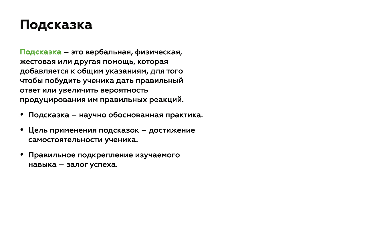 Подсказка — это вербальная, физическая, жестовая или другая помощь, которая добавляется к общим указаниям длятого, чтобы побудить ученика дать правильный ответ или увеличить вероятность продуцирования им правильных реакций1. Комбинируя подсказки с закреплением навыка, мы получаем мощный инструмент, помогающий нашим ученикам учиться. Сразу важно отметить, что наша цель — обретение детьми самостоятельности. Применяя подсказки, мы оказываем нашим ученикам помощь при формировании навыка, но в конечном счете стремимся к тому, чтобы по мере освоения навыка они проявляли как можно больше самостоятельности.