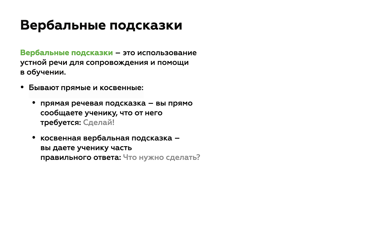Вербальные подсказки для сопровождения и помощи в обучении подразумевают использование устной речи. Существуют прямые и косвенные речевые подсказки. С помощью прямой речевой подсказки вы сообщаете ученику, чего именно от него ожидаете. Например, учитель у доски дает задание измерить длину отрезка. Ученик знает, как это сделать, но его отвлекло большое количество предметов в пенале. В таком случае подсказкой может быть словесная помощь педагога: «Возьми линейку». Это прямая подсказка. А с помощью косвенной подсказки вы предлагаете ученику часть правильного ответа, чтобы направить его в нужное русло. Например, пишете на доске словосочетание «птица летит» и просите определить существительное и глагол. Если ученик знает принцип определения частей речи, можно дать подсказку: «Слово „птица“ отвечает на какой вопрос?» Ученик отвечает: «Кто». Вы спрашиваете: «Значит, это какая часть речи?» Ученик отвечает: «Существительное». Это пример косвенной подсказки.