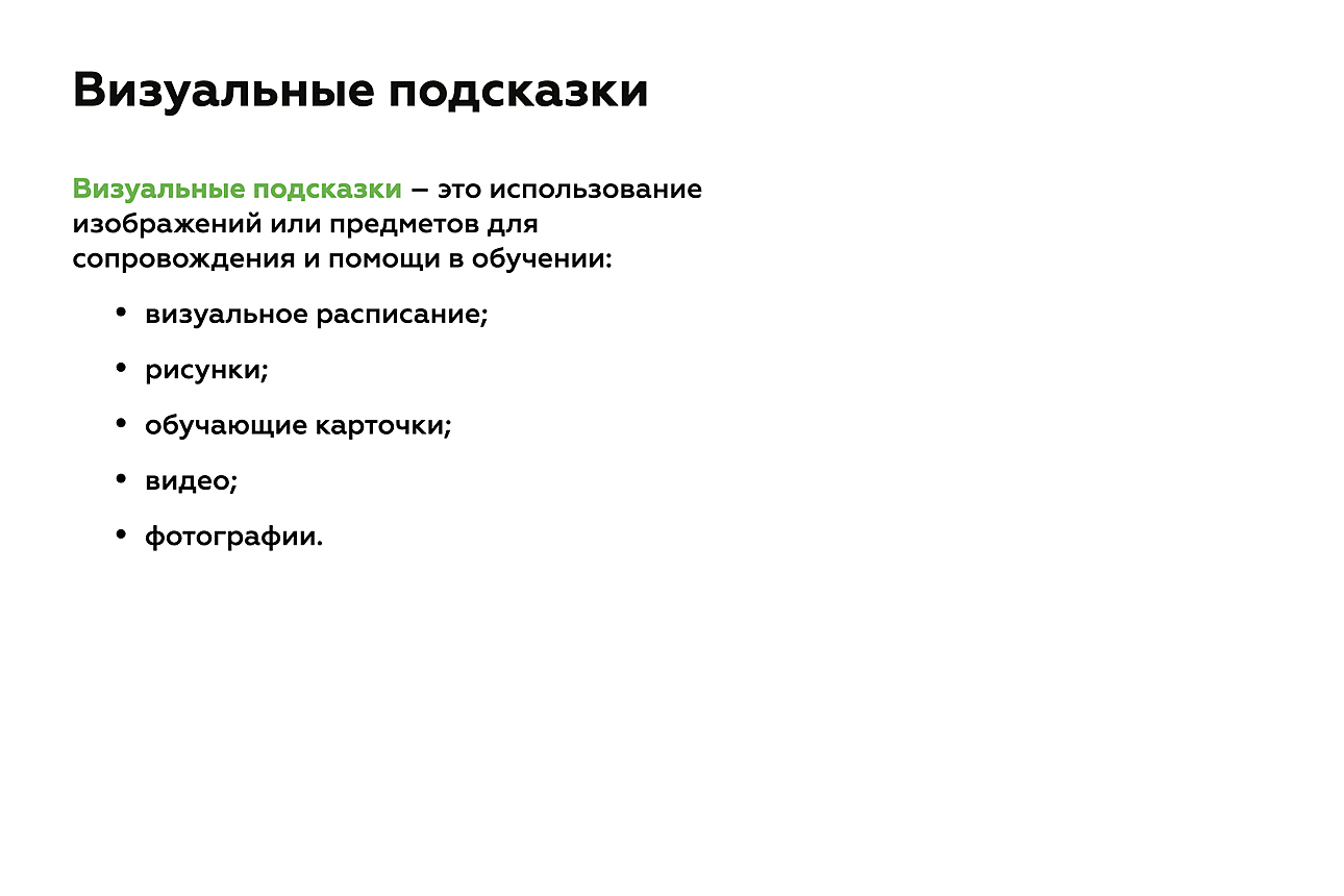 Существуют также визуальные подсказки4 — это разного рода изображения, объектные подсказки (предметы и вещи), которые предоставляют информацию, помогающую ученику правильно выполнить задание.