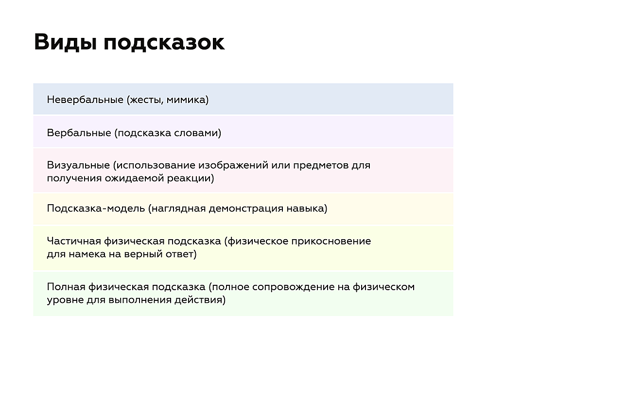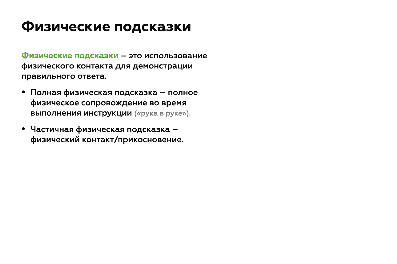 И наконец, существуют физические подсказки — полные и частичные. Частичные физические подсказки — это простое прикосновение, чтобы намекнуть на правильное действие, а полные физические подсказки — полное сопровождение на физическом уровне (например, рука в руке), чтобы помочь ученику в выполнении действия.