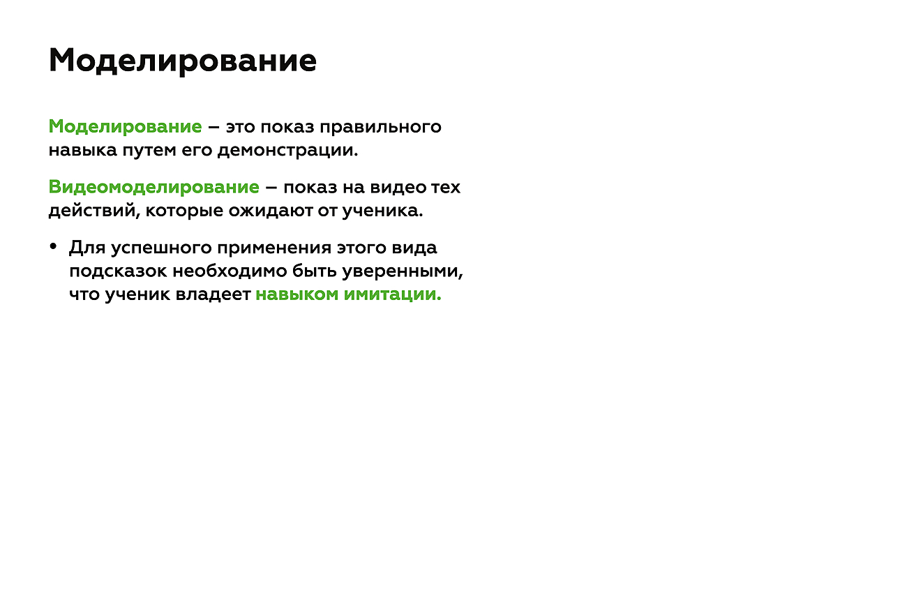 Отдельно выделяют подсказки-модели. Моделирование5 — это наглядная демонстрация того, что должен сделать ученик по нашему указанию.