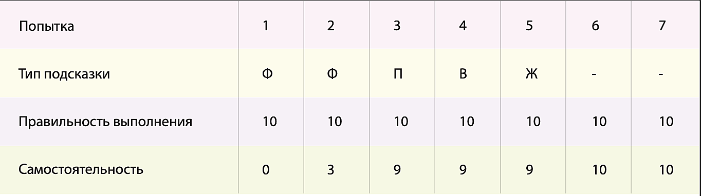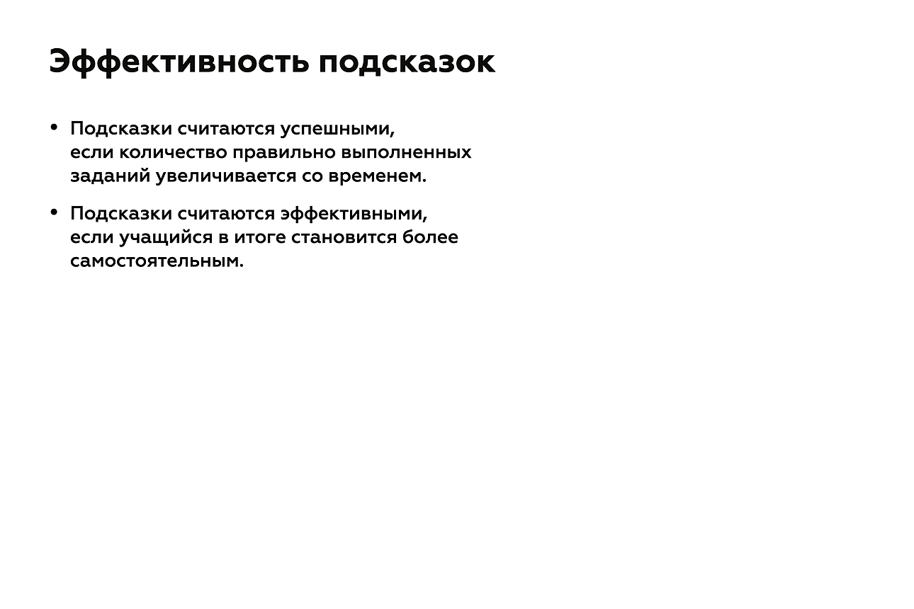 - Мы понимаем, что подсказка сработала, если она больше не нужна, т. е. ученик может выполнить действие сам или ему нужно меньше помощи (снижение уровня подсказки).