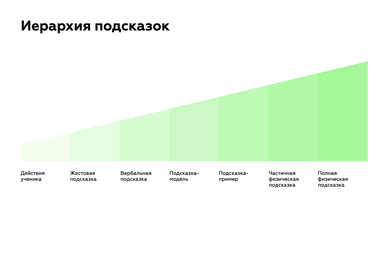 Вы могли заметить, что некоторые подсказки ограничивают ученика больше, другие — меньше. Например, жест гораздо меньше ограничивает возможность ошибки, чем физическое сопровождение ученика «рука в руке», потому что чем выше уровень помощи, тем меньше вероятность совершения ошибки.