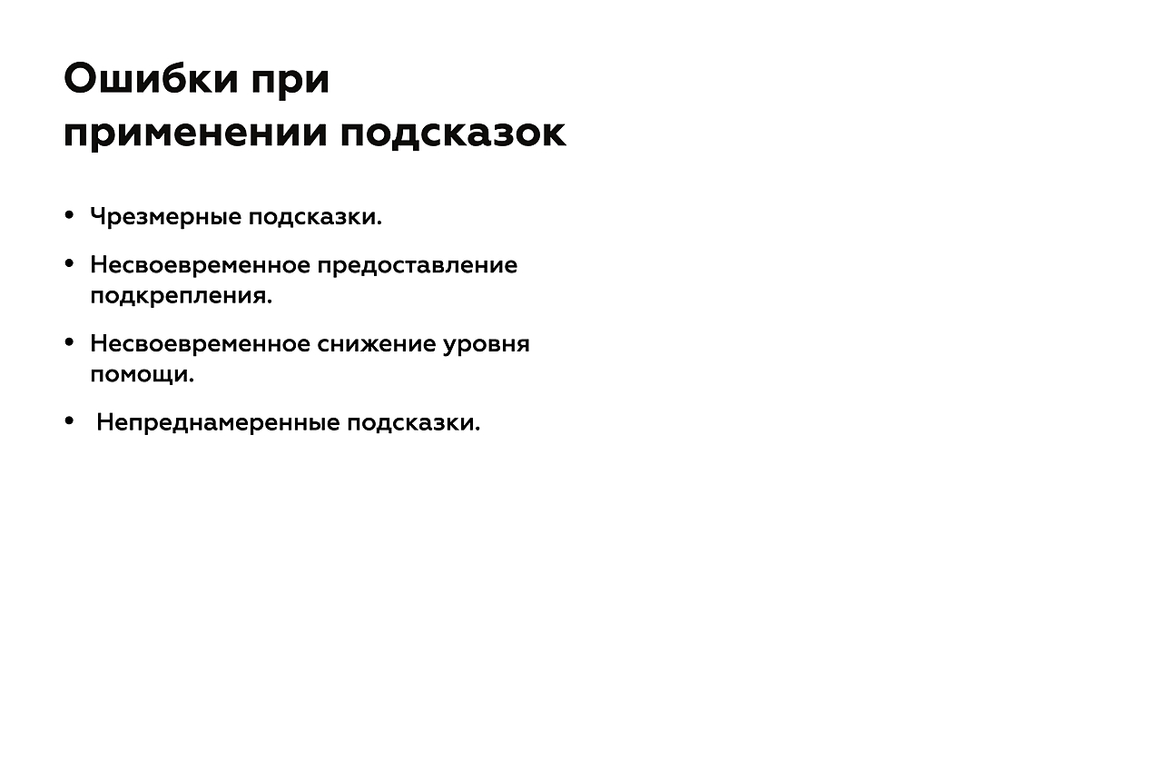 - При использовании подсказок нам следует осознавать собственные ошибки, из-за которых растет зависимость учеников от нас.