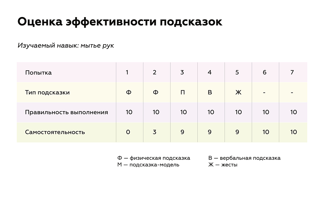 Как узнать, что ваша подсказка эффективна? Можно собрать некоторые данные, и это вовсе не так сложно, как может показаться на первый взгляд. Вот самый простой способ понять, что вы все делаете правильно: ваша подсказка успешно работает, если количество раз, когда ученик демонстрирует ожидаемое от него поведение, со временем увеличивается, а уровень предоставляемой подсказки уменьшается. Еще один признак вашей эффективности — повышение уровня самостоятельности ученика. А самый простой способ собрать нужные данные — это заполнение таблицы при обучении ребенка с РАС новому навыку. Скажем, если речь идет о мытье рук, то в таблице мы указываем ожидаемое поведение, тип подсказки, дату или номер попытки, а также количество раз, когда ученик помыл руки правильно и самостоятельно.