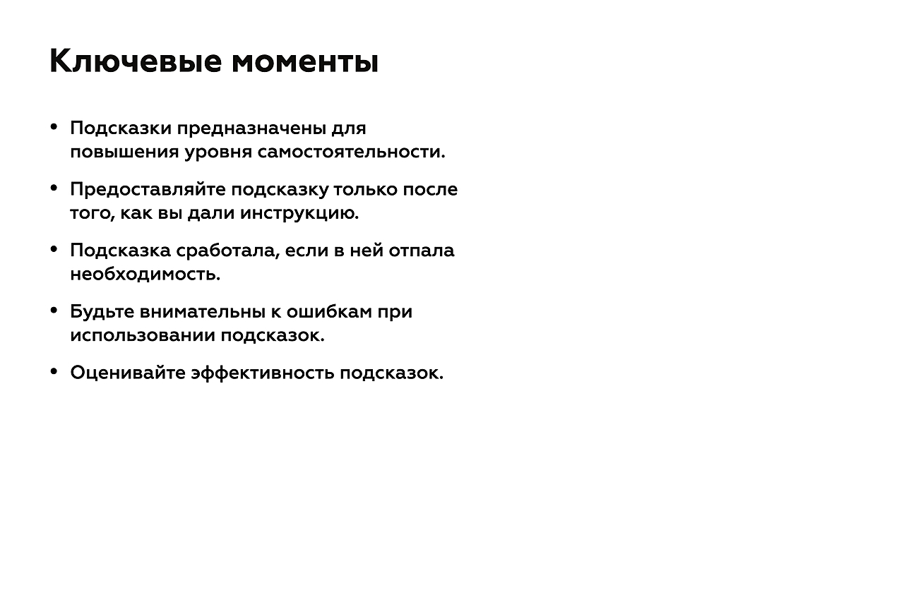 - Помните, что подсказки предназначены для повышения уровня самостоятельности. Мы оказываем помощь учащимся, но со временем мы должны сократить ее, чтобы ученики могли применять навык на максимально высоком уровне самостоятельности, на который они только способны.