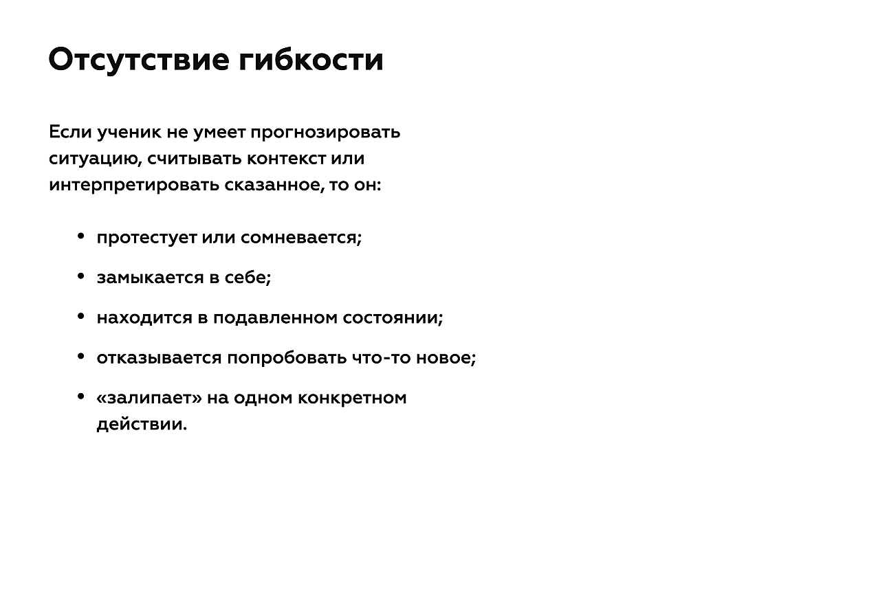 Отсутствие гибкости может проявляться у учащихся с РАС очень по-разному. Например, это может быть стремление ученика дописать все слова или буквы до конца строчки и возникновение протестного поведения, если, не закончив пропись на одной строке, нужно переходить к следующей. Также очень частым проявлением отсутствия гибкости бывает протестное поведение при внезапной смене учителя или тьютора. Такие ситуации бывают нередко — педагог может заболеть, его могут вызвать в другой класс. Учащимся с РАС бывает очень сложно принять такие перемены.