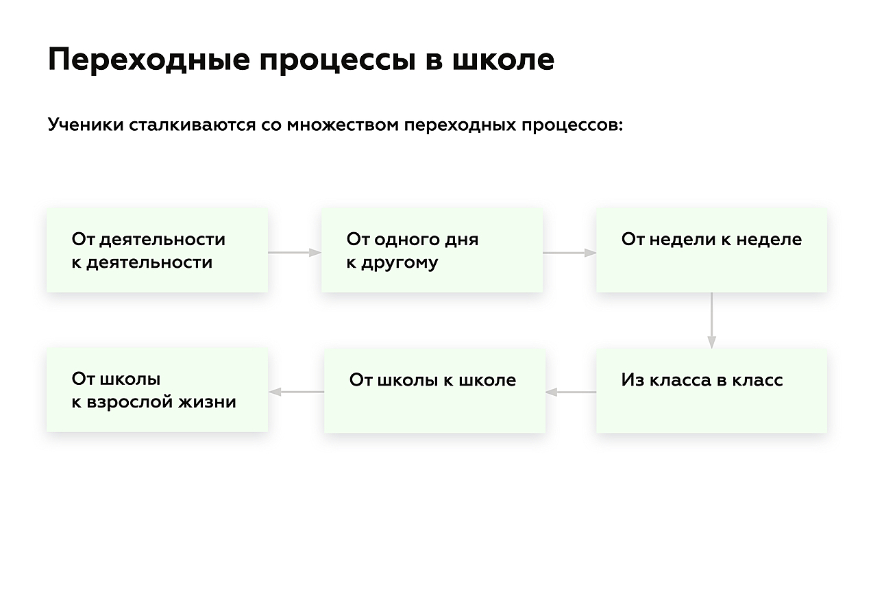 Переходы от занятия к занятию день за днем, неделя за неделей происходят у всех учеников и требуют от них осознания и понимания этих ежеминутных, ежедневных и еженедельных переходов. Более масштабные переходные процессы, требующие, соответственно, большей поддержки, происходят, например, когда ученик становится на год старше и оказывается в следующем классе. Именно поэтому в начале учебного года большинство учителей проводят вводные уроки и специальные мероприятия, чтобы помочь ученикам адаптироваться к новым условиям. Всем известно, что это важный этап для всех учащихся. Для многих учеников следующим будет переход из средней школы в старшую, а из старшей — в высшее учебное заведение.