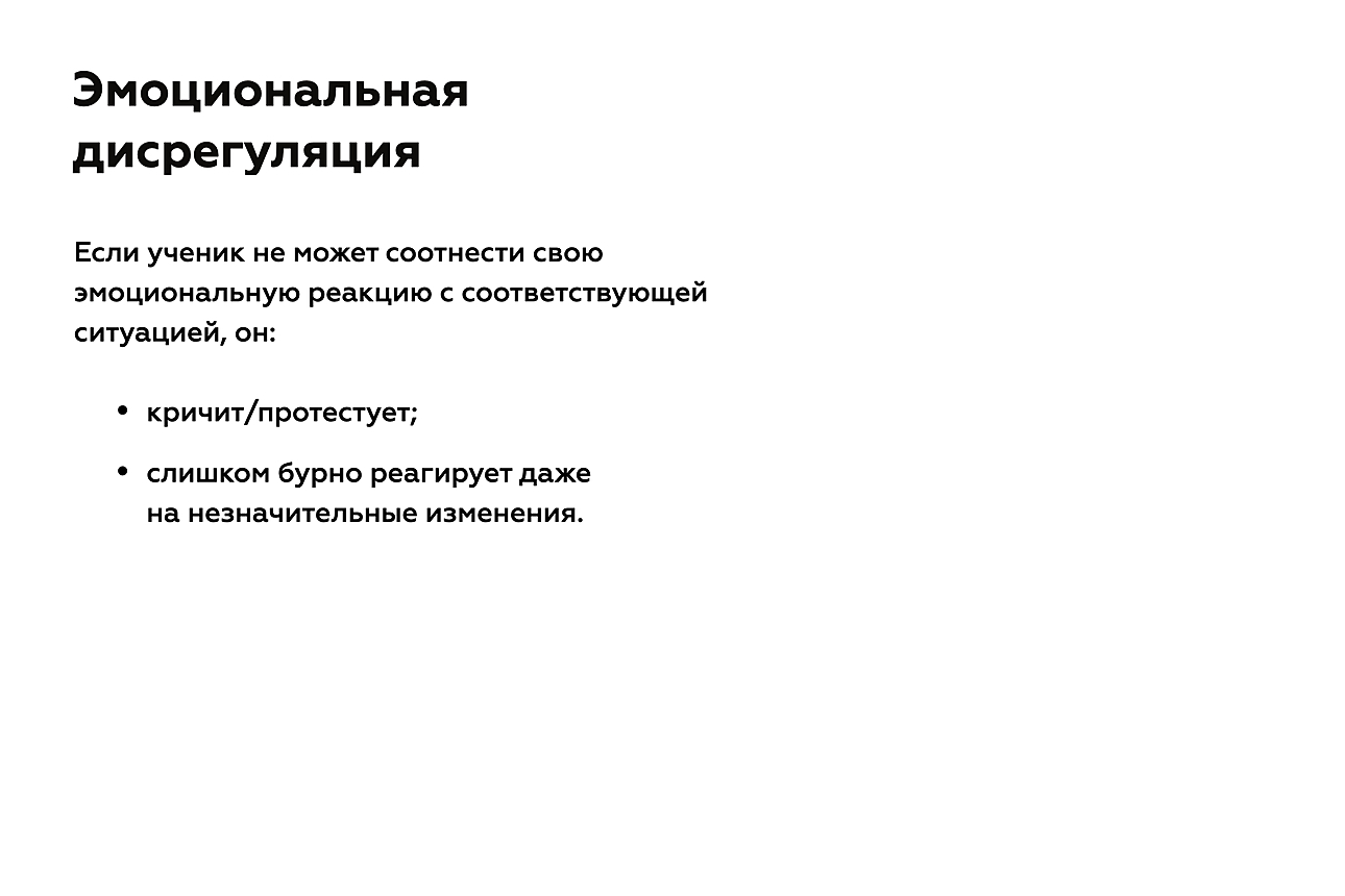 Мы рассмотрели несколько наглядных примеров, как люди с расстройствами аутистического спектра могут реагировать в конкретных ситуациях, связанных с неспособностью контролировать эмоции и принимать самостоятельные решения. Эти проявления могут быть неверно истолкованы людьми, которые не имеют представления о том, что такое аутизм. Действия учеников с аутизмом могут рассматриваться как вздорный характер и плохое поведение. Но мы с вами понимаем, что, с точки зрения учащегося с аутизмом, изменения в повседневных привычках, распорядке дня, обстановке, действиях окружающих людей являются огромной проблемой и поэтому вызывают в нем бурю эмоций. Когда ученик не может спрогнозировать дальнейшие действия, понять, что происходит или что ему говорят, он может протестовать или сомневаться, устроить истерику, отказаться пробовать новое или внезапно прекратить делать то, что начал.