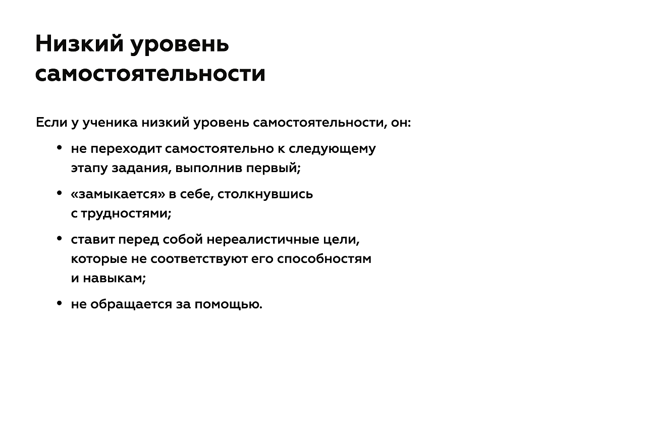 Для того, чтобы ученик мог быть самостоятельным, у него должны быть развиты определенные навыки, обучение которым может включать следующие шаги: