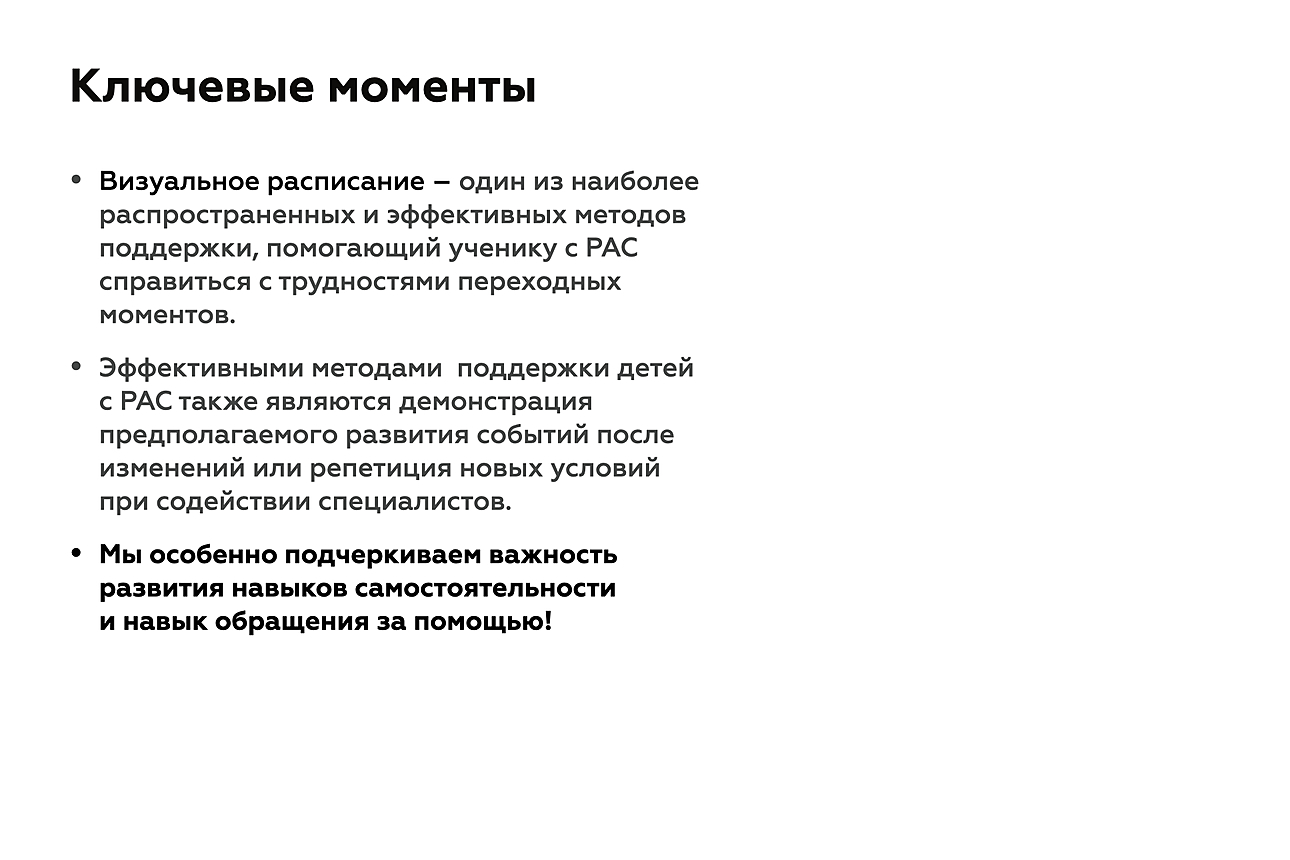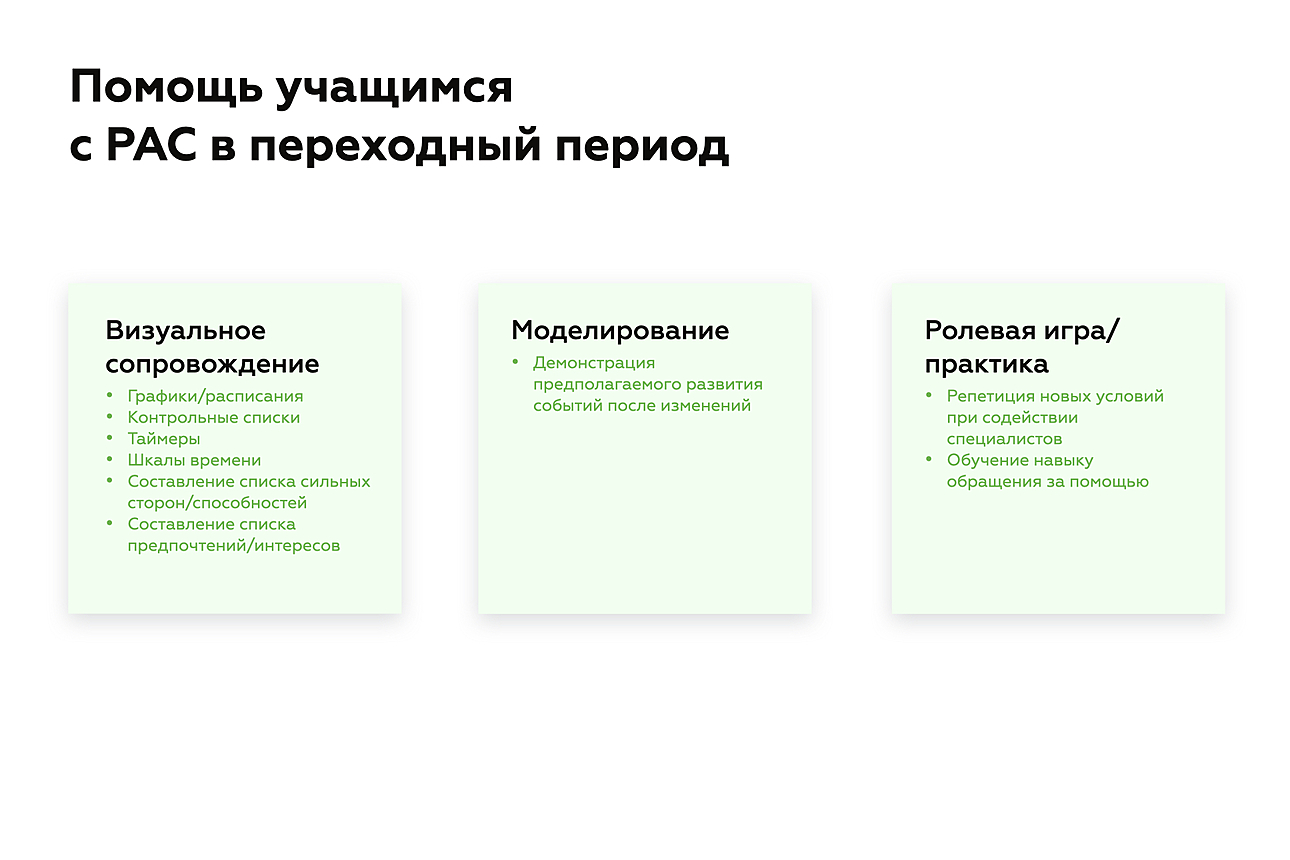 - Эффективными методами поддержки детей с РАС также являются демонстрация предполагаемого развития событий после изменений или репетиция новых условий при содействии специалистов.