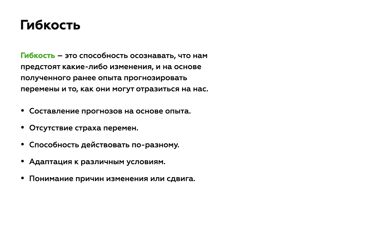 Важная составляющая гибкости — признание того, что перемены — это нормально, что в них нет ничего сверхъестественного. В ситуации, о которой мы говорили выше, изменение связано с пониманием хода времени и уверенностью в том, что вскоре появится возможность вернуться к интересной теме. Осознание такого изменения требует наличия способности адаптироваться к внешним факторам и устанавливать между ними связь.