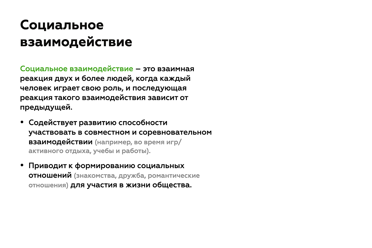 В предыдущих лекциях мы уже обсуждали, что социальное взаимодействие1 — это взаимная реакция двух и более людей, когда каждый человек играет свою роль, и последующая реакция в таком взаимодействии зависит от предыдущей. Социальные интеракции чрезвычайно важны, поскольку развивают способность детей и взрослых к совместному обучению (в том числе с некоторым соревновательным компонентом, проявления которого мы можем наблюдать во время игр и активного отдыха, учебы или работы). Все навыки, которые дети приобретают, начиная с первых дней пребывания в дошкольном учреждении и на протяжении всех школьных лет, готовят их к участию в совместном взаимодействии. В конечном счете — это формирует социальные отношения, ведь все мы хотим иметь знакомых, к которым мы могли бы обратиться по тому или иному поводу, близких друзей и тех, с кем мы могли бы построить в будущем романтические отношения.