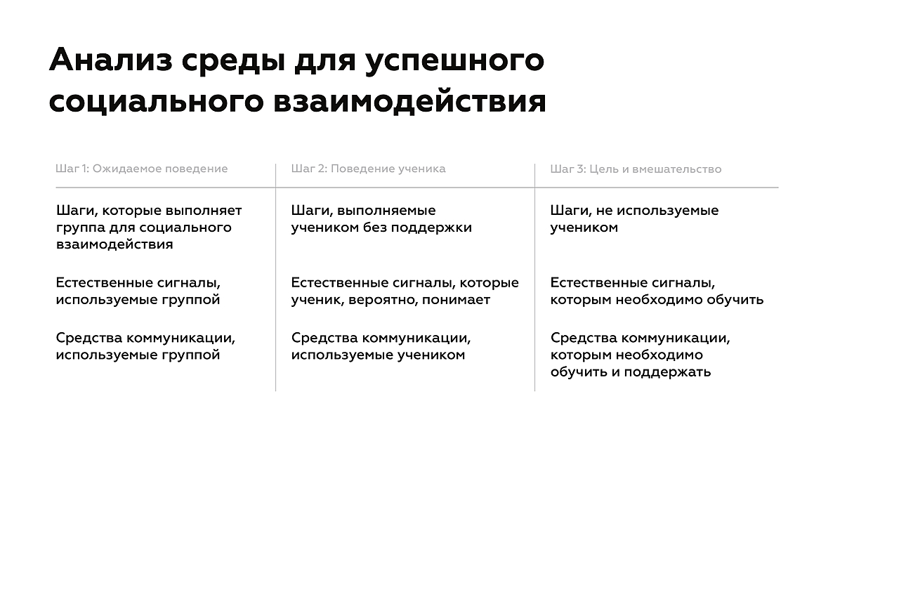 Вот почему мы решительно выступаем за то, чтобы каждый, кто работает с учениками с РАС, умел выполнять анализ среды. По сути, задача педагога — наблюдать за типичными ситуациями и определять, каковы ожидаемые модели поведения участников группы (что в данной конкретной обстановке является для учеников ожидаемым поведением). Такой анализ проводится поэтапно. Сначала вы наблюдаете и фиксируете имена учащихся, у которых не возникло никаких проблем при социальном взаимодействии. Затем вы отмечаете имена тех, у кого возникли определенные трудности (т. е., возможно, эти дети могут соответствовать ожиданиям, но не всем). И, наконец, третий шаг — это разработка плана по поддержке таких учеников, чтобы научить их успешно демонстрировать социально ожидаемое поведение в классе.