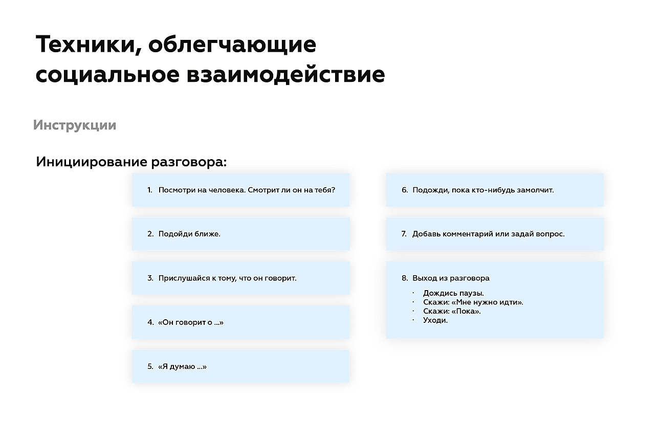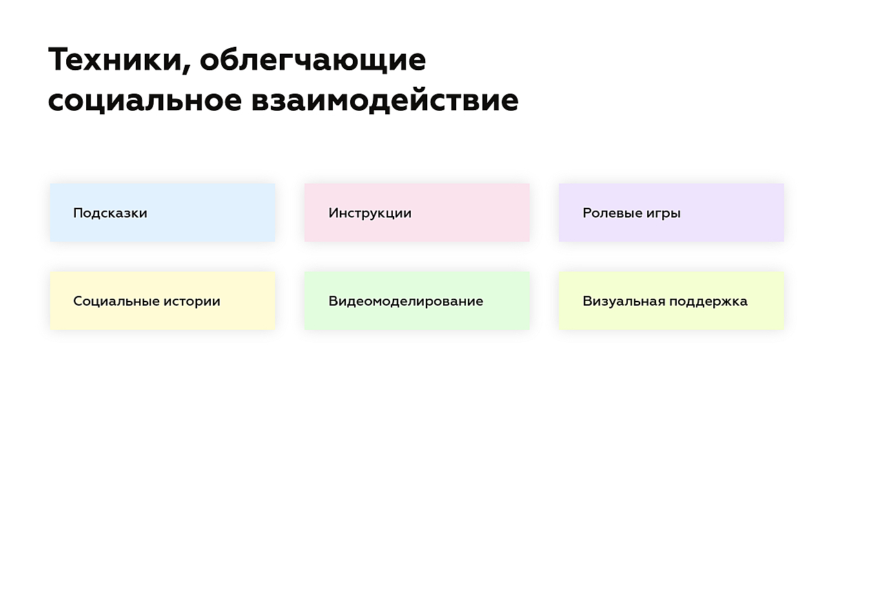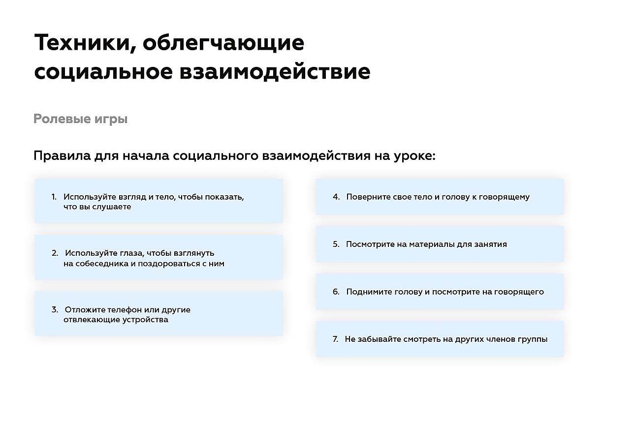Мы поговорили о том, что подразумевает под собой социальное взаимодействие, и о тех навыках и умениях, которые необходимы человеку для успешного взаимодействия с другими. Рассмотрим на практических примерах несколько стратегий, которые могут помочь учащимся с РАС освоить необходимые навыки.