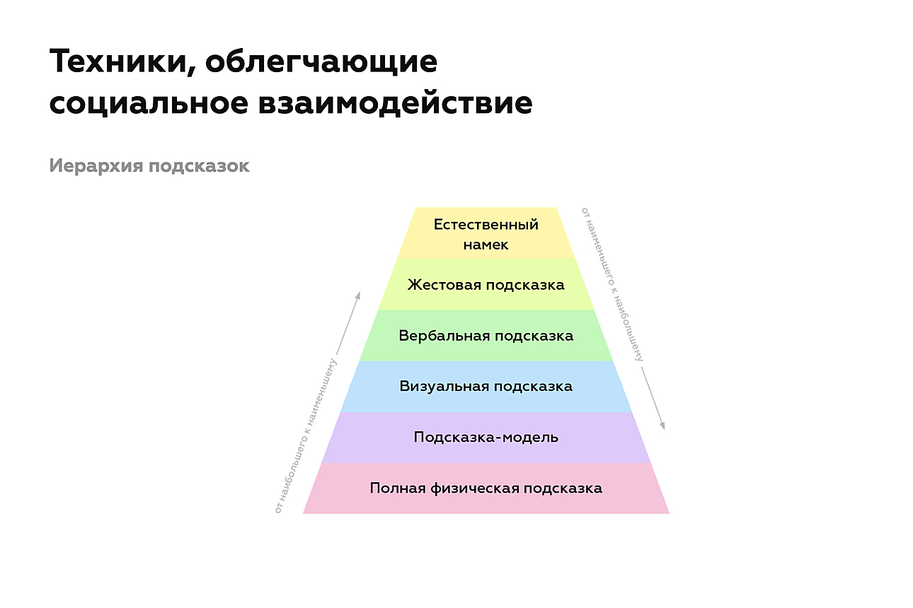 В заключение напомним о нескольких помогающих техниках, о которых мы уже не раз говорили в предыдущих лекциях. Первая связана с иерархией подсказок, вторая — с обеспечением визуальной поддержки. С помощью этих стратегий мы можем подсказывать ученику правила социального поведения.