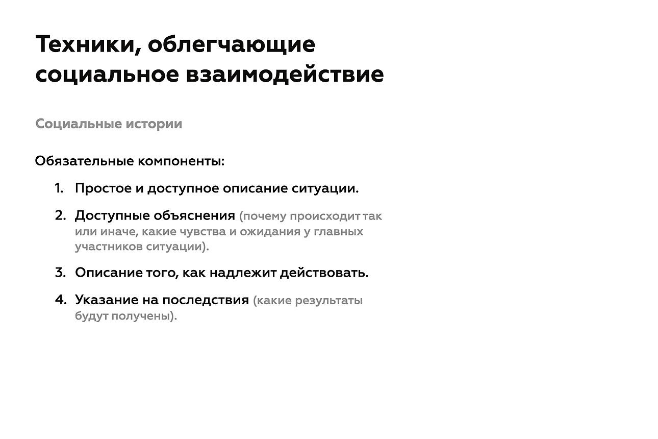 Социальная история10 — это описание какой-либо ситуации, навыка или достижения для конкретного человека, которая помогает ему лучше разобраться в сложных и непредсказуемых событиях, а также облегчает понимание последовательности действий. Социальная история представляет собой визуальный стимул, по оформлению похожий на комикс: последовательность картинок, отображающих какие-то действия человека и содержащих краткие подписи.