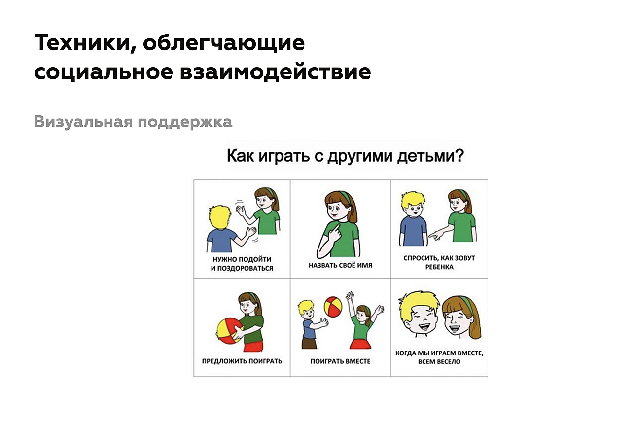 Еще одна важная составляющая успешного взаимодействия — это поддержка партнеров по коммуникации детей с РАС при возникновении ситуации, предполагающей взаимодействие. Этими партнерами могут быть одноклассники без особенностей развития, дети с другими особенностями или незнакомые (малознакомые) взрослые.