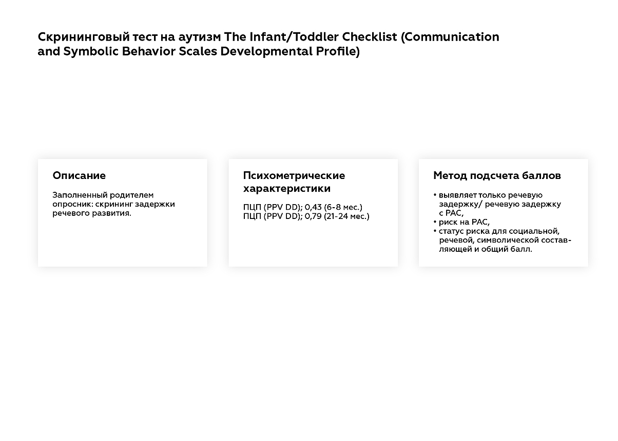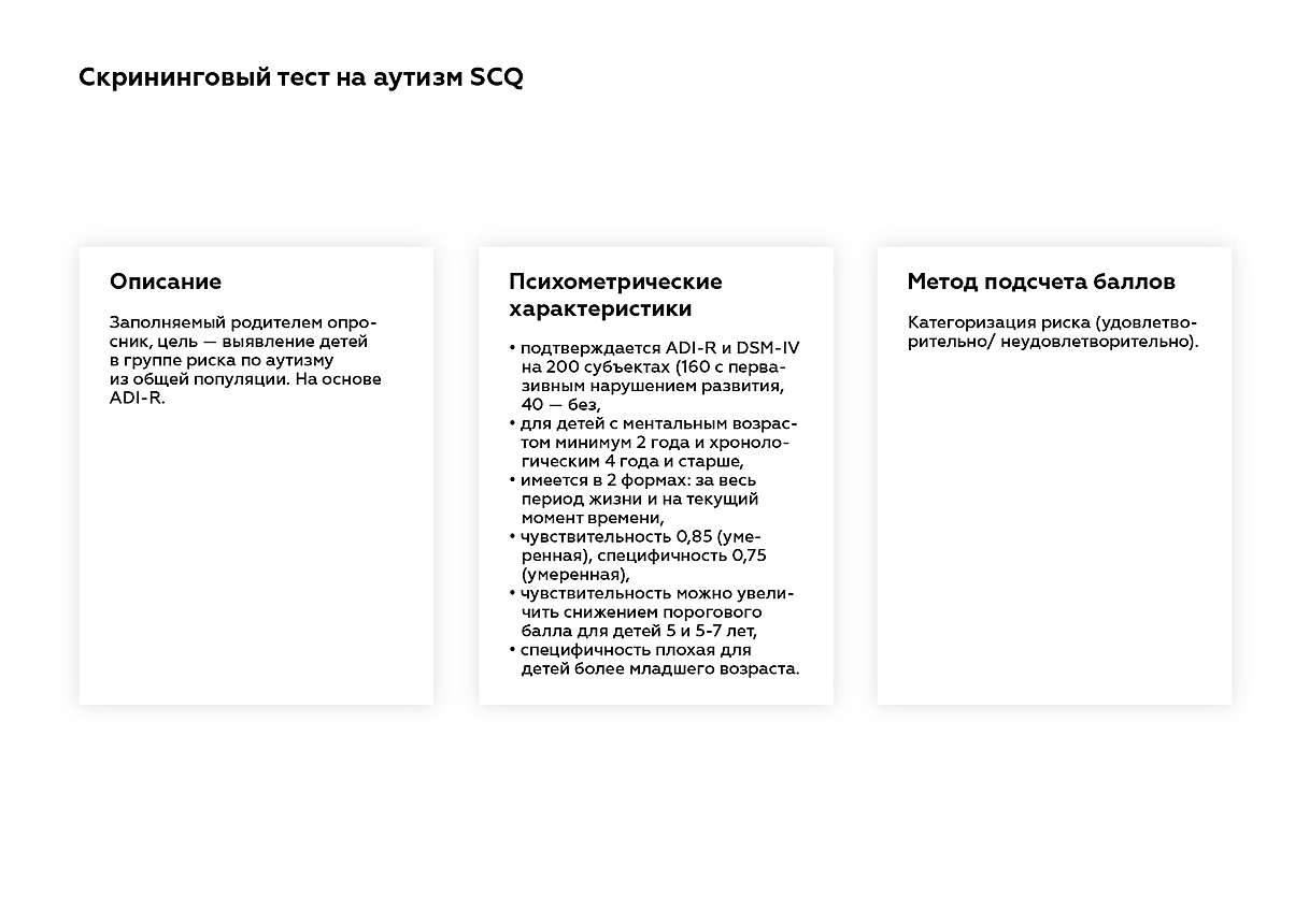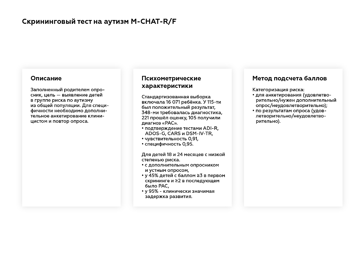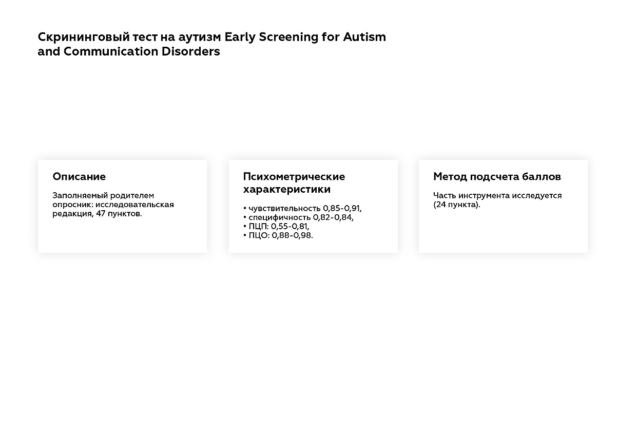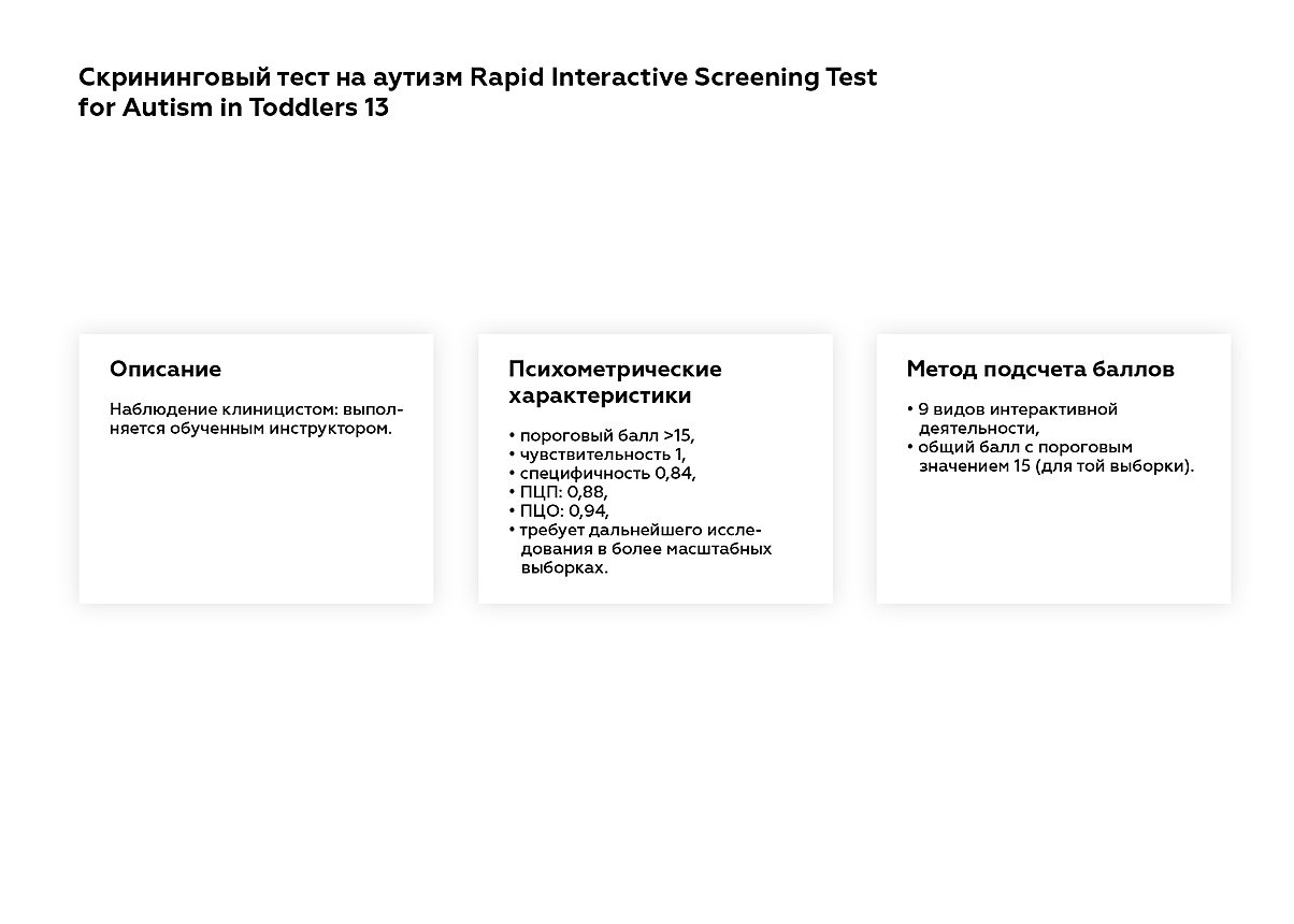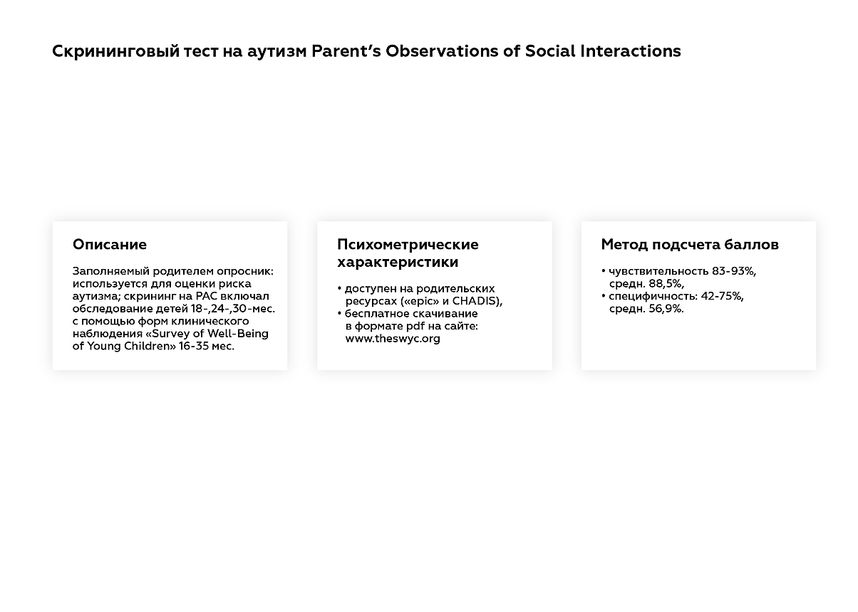 Это далеко не полный список существующих скрининговых методов для РАС, однако только эти методы подтверждены качественными исследования и переведены и адаптированы на русский язык. Валидизация данных инструментов на российской популяции проводилась, однако требует дальнейших исследований из-за небольшого количества участников в существующих исследованиях.